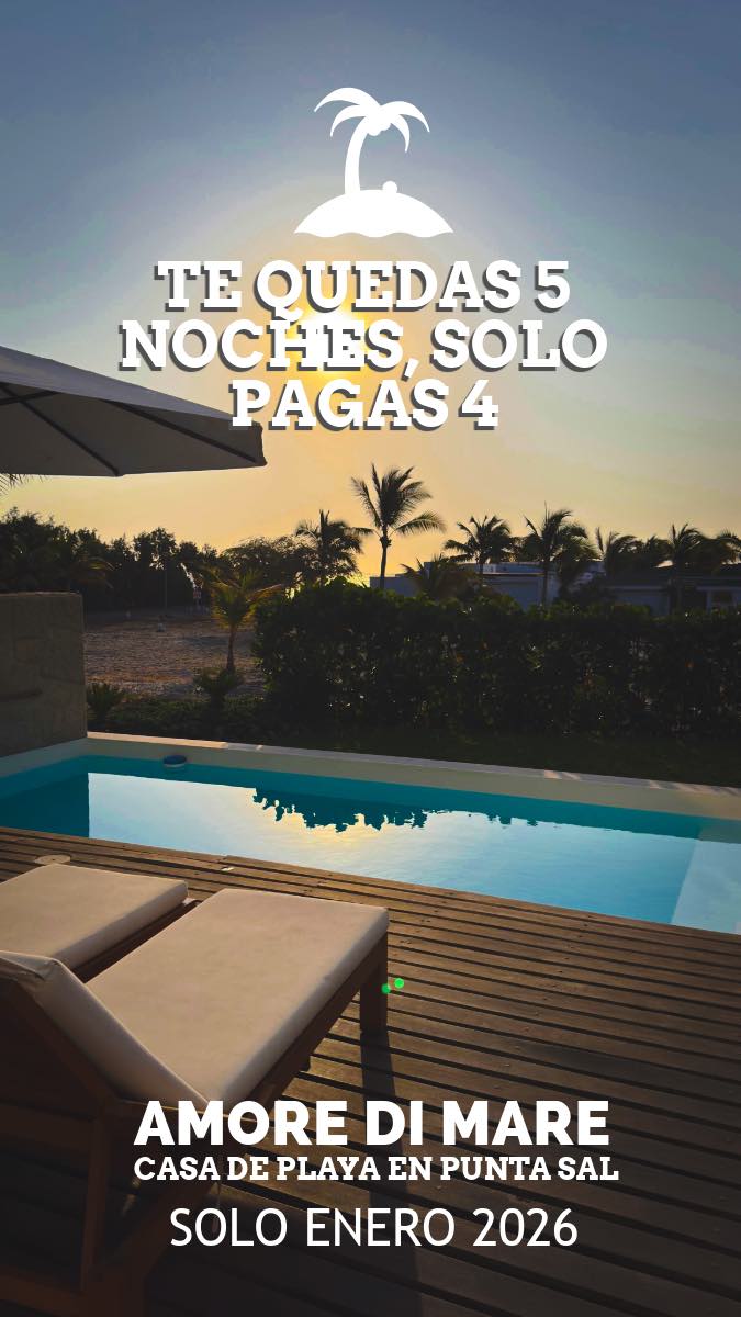 Amore di Mare (capacidad 16 personas en 5 habitaciones), casa de playa ubicada en el exclusivo Condominio Punta Sal, cuenta con una promoción solo válida para este próximo enero 2026 (no disponible para fechas de año nuevo): Te quedas 5 noches, solo pagas 4 noches.