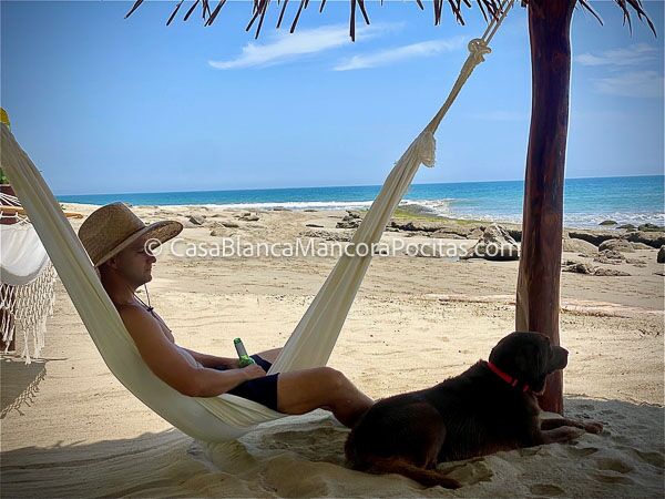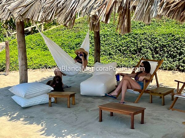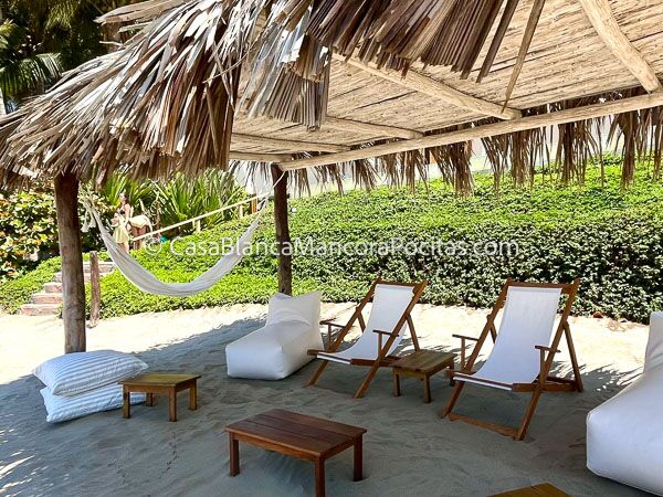 En la playa frente a Casa Blanca Beach Front cuenta con toldo, sillas, cojines grandes para la arena y hamacas.