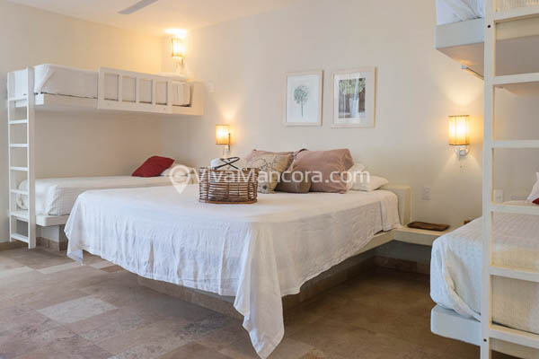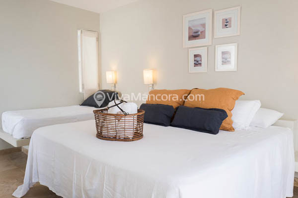 Dos habitaciones en primer piso con vista al mar, cada una con cama King y 2 camarotes (hasta para 6 personas por habitaciones).